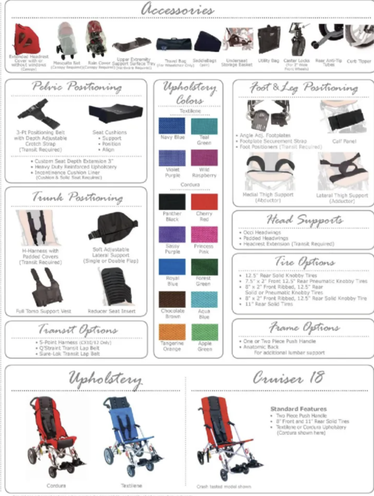 Tùy theo tình trạng Trẻ, mà bên cạnh việc chọn độ nghiêng của lưng ghế xe đẩy, ta cần chọn thêm các phụ kiện đi kèm để hỗ trợ thêm tư thế của Trẻ.Trong phần này, Phương Hà sẽ giới thiệu một số phụ kiện hay sử dụng và tác dụng của nó.