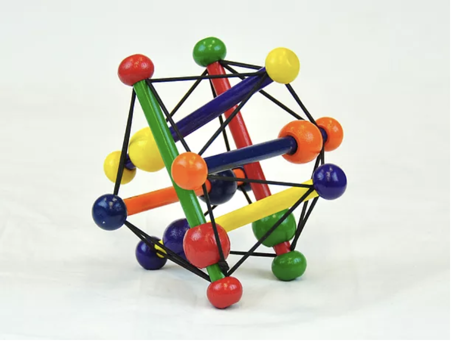 • Giống như món đồ chơi phía trên, các thanh gỗ không tiếp xúc trực tiếp với nhau mà được giữ cố định bởi các sợi dây thun xung quanh chúng.